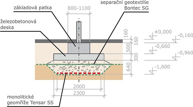 Pod nosnými zdmi objektu byl navržen roznášecí štěrkový polštář stabilizovaný na své bázi dvouosou monolitickou geomříží Tensar SS, která byla pokládána symetricky na osu zdí v šíři 2 m. Dvouosá geomříž v kombinaci se zrnitým zásypovým materiálem umožňuje vytvoření efektu vzájemného „zazubení“ mezi částicemi sypaniny a geomříží. Tento mechanismus zabraňuje laterálním posuvům částic na bázi stabilizované vrstvy, čímž se výrazně zvyšuje únosnost měkkého podloží.