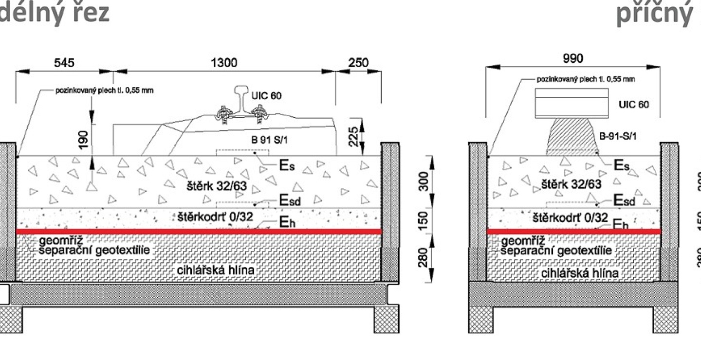 Konstrukční vrstva byla tvořena drceným kamenivem z amfibolitu frakce 0/32 mm. Kolejové lože bylo tvořeno drceným kamenivem z amfibolitu frakce 32/63 mm.