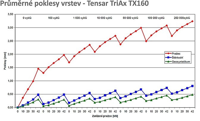 Laboratorní testy na vzorcích stabilizačních geomříží byly provedeny na modelech pražcového podloží v měřítku 1:1 s 250 000 zatěžovacími cykly. Během zatěžovacích cyklů byly měřeny poklesy jednotlivých vrstev a dále statické a dynamické moduly přetvárnosti.