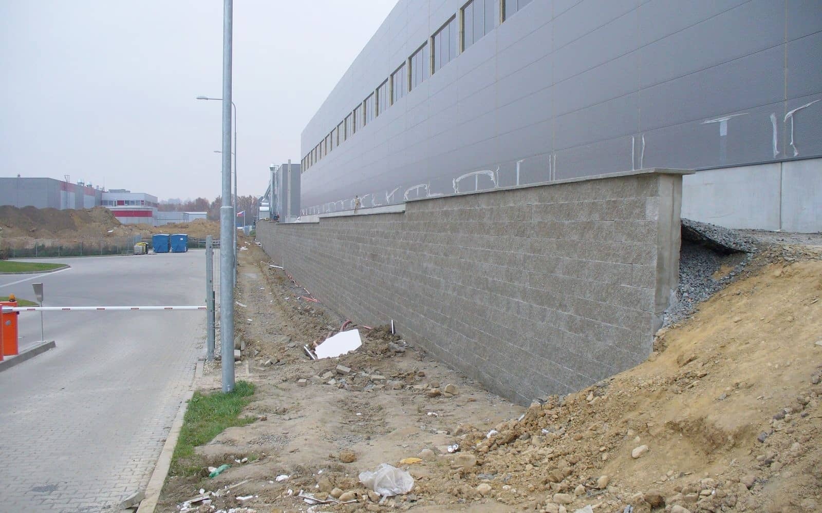 Navržená vyztužená opěrná konstrukce pomohla vyřešit výškový rozdíl mezi projektovanou komunikací a nově budovanou halou.