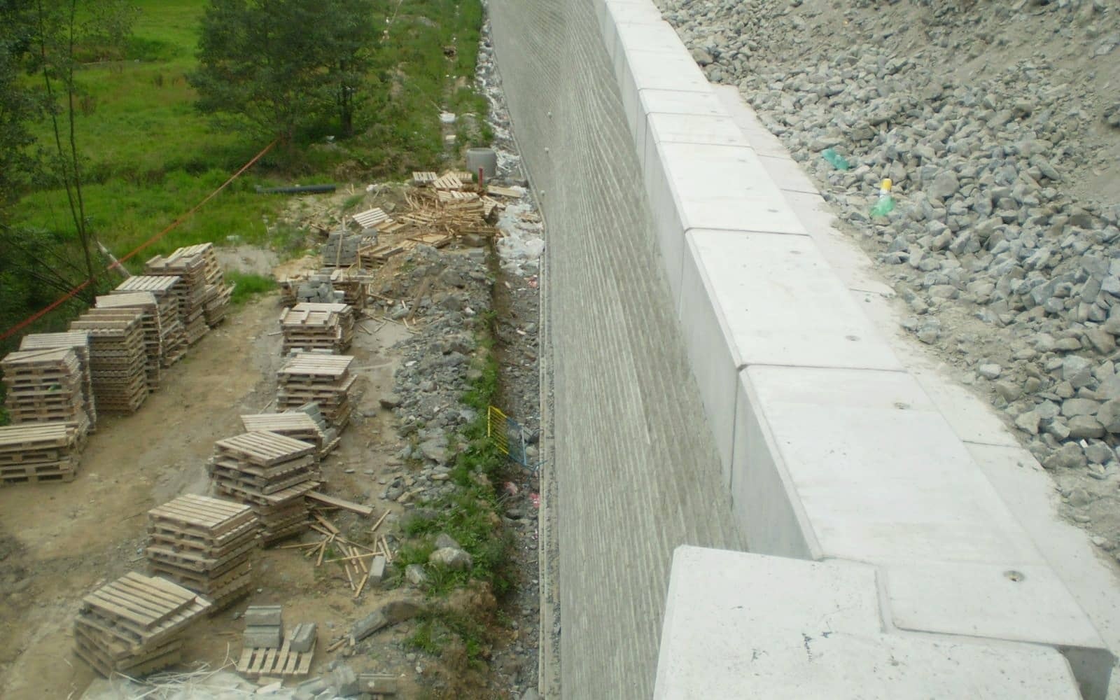 Jedná se o trvalou opěrnou zeď podchycující patu rozšířeného železničního násypu. Výška zdi je proměnná od 0,60 m do 9,65 m ve sklonu 86° od vodorovné. Nad korunou zdi je nadnásyp výšky cca 2,20 m ve sklonu 1:1,50. Na začátku úseku zeď plynule přechází do terénu, na konci navazuje na železniční most. Koruna zdi navazuje na čelo mostu ve výšce mostní římsy.