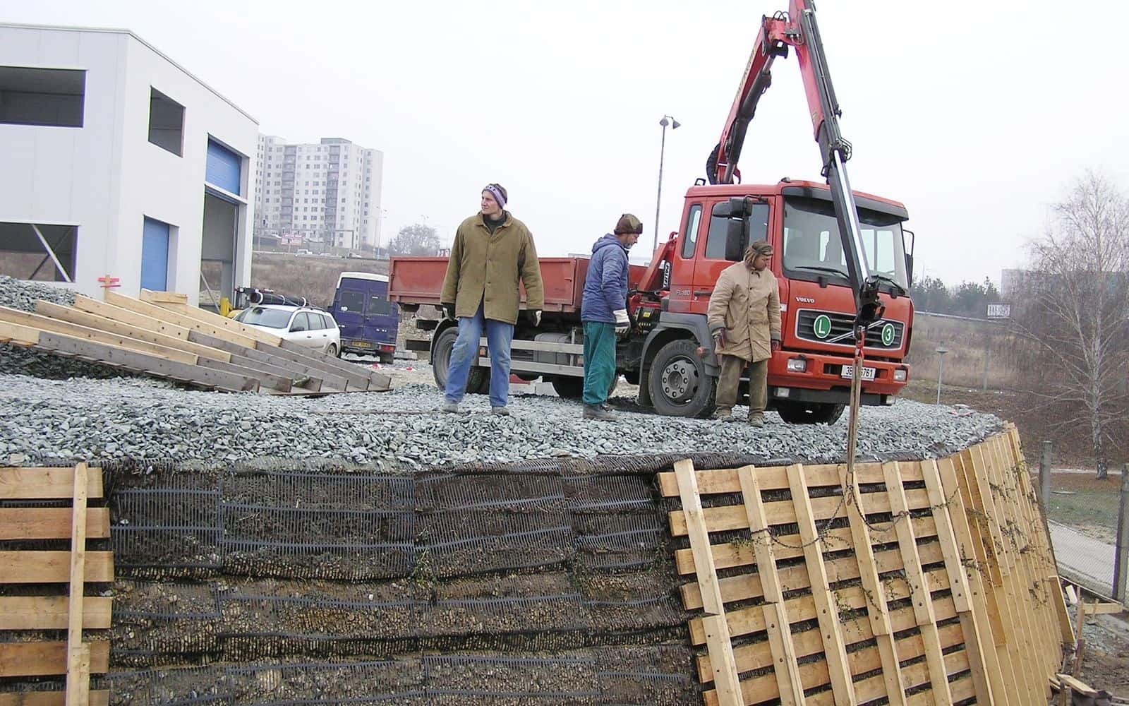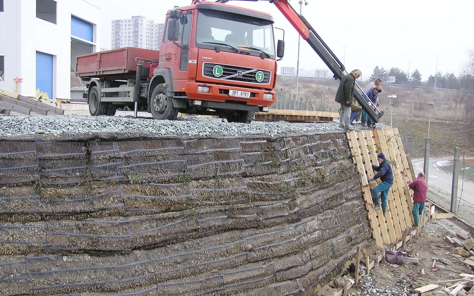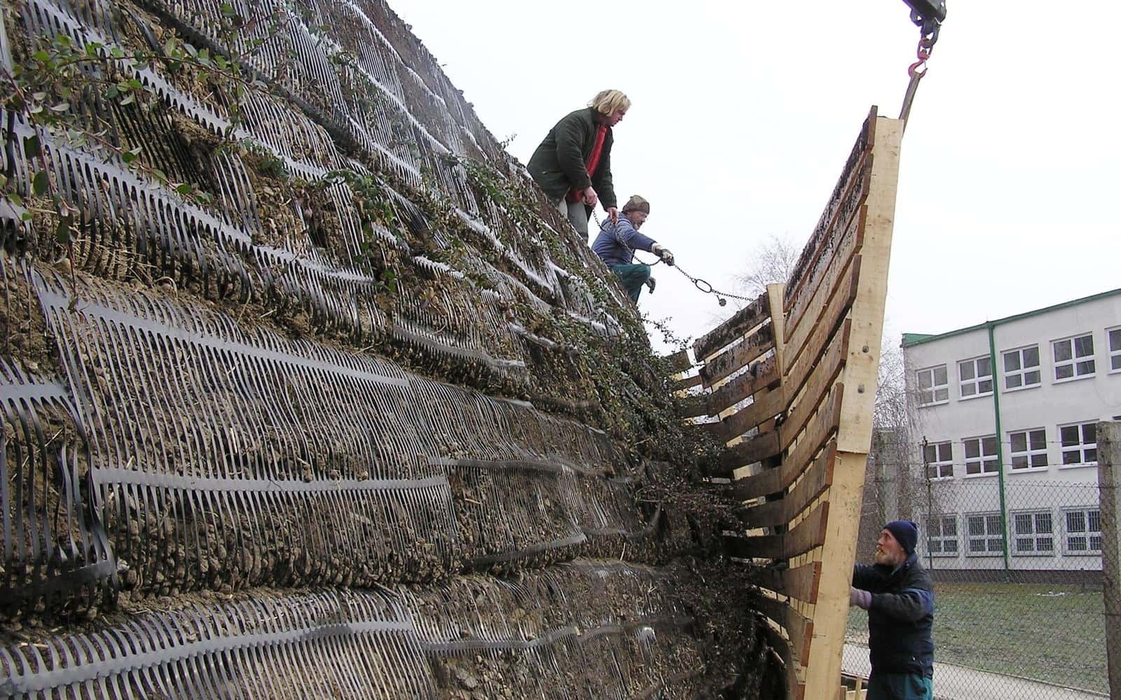 Opěrná konstrukce/strmý svah za použití vyztužené zeminy.