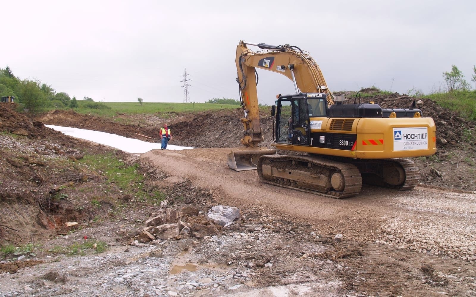Instalace netkané polypropylenové geotextilie pro separaci konstrukčních vrstev přístupové cesty k portálu tunelu Ovčiarsko - Hričovské Podhradie.