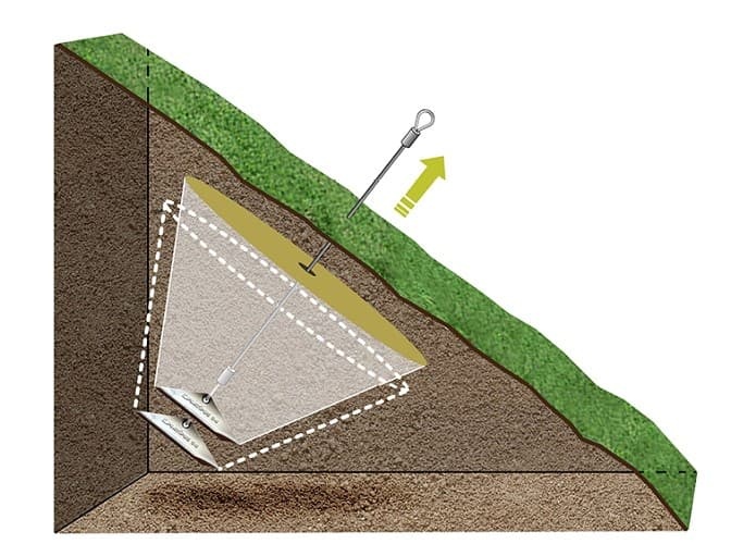 Instalace zemních kotev se provádí pomocí nastavitelných ocelových tyčí. První dílec je vsazen do otvoru v kořeni kotvy a vhání kotevní systém do zemního prostředí. Pro příklep se používají