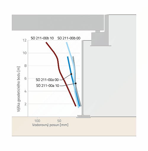 Z výsledků vyhodnocení je patrné, že poslední měření vykazují ustálení rychlostí sedání, a tedy ustálení konsolidace násypu. Plnou barvou je znázorněn čas, kdy probíhala výstavba od úrovně zemní pláně. Toto značení je platné pro všechny uvedené grafy v článku. Geodetická měření byla prováděna na nivelačních značkách umístěných na lícních panelech. Tato měření stanovovala průběžné vodorovné a svislé deformace panelů a vyztuženého bloku v důležitých fázích výstavby a následně pravidelně v předepsaném časovém intervalu. Jako počáteční měření pro vyhodnocování deformací s ohledem na predikované hodnoty byl uvažován stav, kdy byly opěry zasypány do plné výšky, tedy do úrovně úložného prahu. Grafy na obr. 7 až 10 zobrazují výsledky měření profilu nacházejícího se v ose jednotlivých mostů. Sedání úložného prahu (graf na obr. 7) dosahovalo pro obě opěry objektu 211-00a a opěru 00 objektu 211-00b obdobných hodnot, kdy se konečná hodnota dle posledního měření ustaluje na hodnotě 45 mm. Odlišné chování vykazuje opěra 211-00b 10, kde konečná hodnota sedání dosahuje hodnoty dvojnásobné, tedy 90 mm. Tato opěra současně vykazuje i vyšší vodorovné deformace sledovaného profilu.