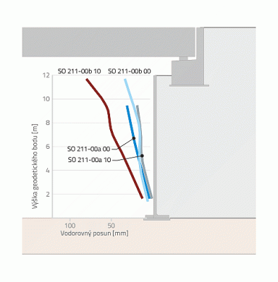 Svislé deformace líce opěr (graf na obr. 8) jsou pro jednotlivé opěry rozdílné. Nejnižších hodnot dosahovalo sedání líce u opěry 211-00a 00, naopak nejvyšší hodnoty byly naměřeny na opěře 211-00b 10, a to cca 30 mm. Rozdílné chování odpovídá především rozdílným geologickým podmínkám. Vodorovné deformace (graf na obr. 9) měřené v koruně panelového opevnění sledují u jednotlivých opěr svislé deformace úložného prahu. Maximálních hodnot bylo dosaženo u opěry 211-00b 10. K poslednímu měření se hodnoty ustalují na hodnotě cca 85 mm. Počátek měření je pro jednotlivé opěry vždy vybudování násypu za lícními panely do plné výšky. Podstatná část deformací proběhla u opěr vlivem přitížení nosnou konstrukcí mostního objektu a vybudováním přechodových oblastí a násypového tělesa po úroveň pláně. U mostního objektu 211- 00b 10 se v této fázi jednalo o vodorovný posun 55 mm, tedy přibližně 2/3 z celkové hodnoty dosud měřené deformace. Tohoto poměru v rozmezí od 60 do 70 % z celkové hodnoty vodorovné deformace dosahují všechny opěry. Graf na obr. 10 zobrazuje vodorovné posuny jednotlivých opěrných zdí v profilu vedeném v ose mostu. Je patrné, že nejvyšší vodorovné deformace dosahují opěry v horní části panelového opevnění, kde dochází k nejvyššímu ovlivnění vlivem koncentrace extrémního zatížení v těsné blízkosti za rubem opěr. V žádném měřeném bodě však nedošlo k překročení predikované hodnoty 93 mm.