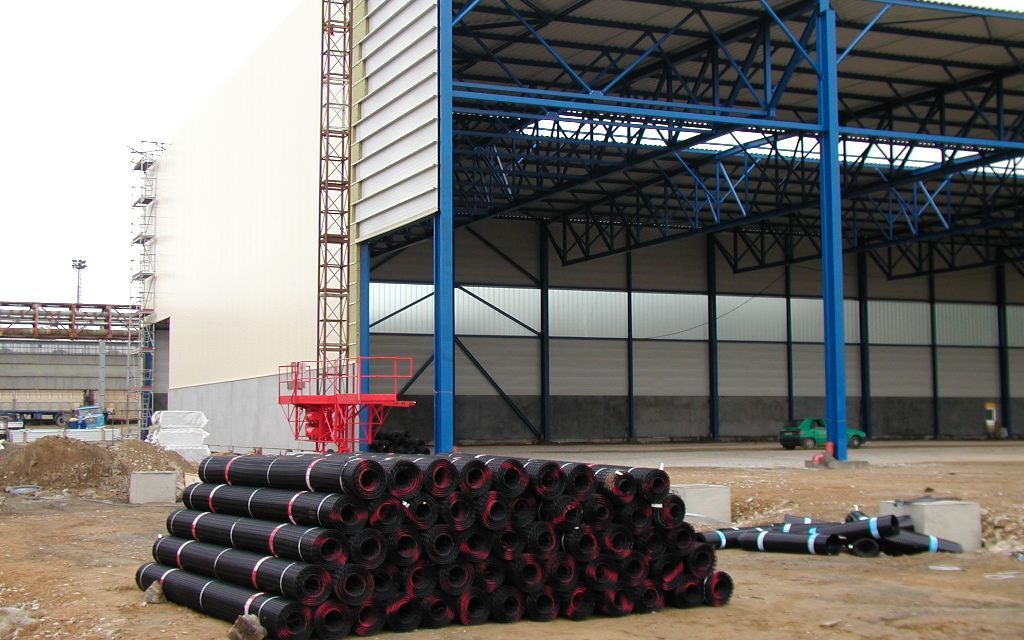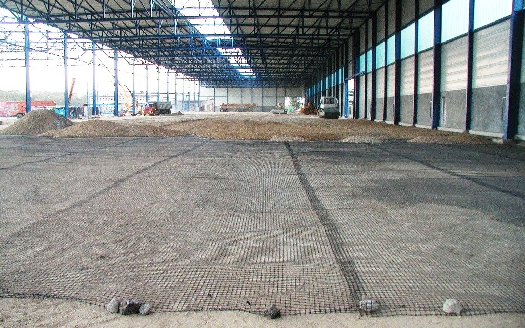 V průmyslových objektech působí vysoké hodnoty zatížení i na podlahy. Aby v tomto případě dokázaly plánovanému zatížení odolávat a neničily se, bylo nutné plošně zpevnit podloží. Použily se výztužné geomříže a kvalitní štěrkodrť, optimálně zhutněná.