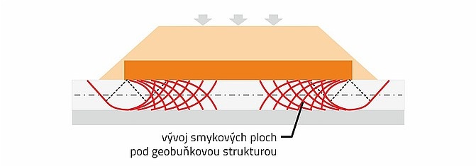 Takto vytvořená trojrozměrná kvazihomogenní základová struktura pak v konstrukci zajišťuje to, že se v násypu neprojevují rozdílné vlastnosti podloží, protože struktura nedovoluje, resp. prakticky odstraňuje nerovnoměrné sedání a vodorovné posuny v podloží. Sekundárními přínosy geobuňkové struktury jsou: