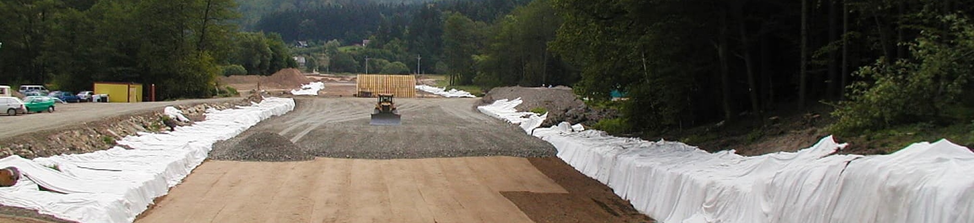 Instalace netkané polypropylenové geotextilie pro separaci konstrukčních vrstev přístupové cesty k portálu tunelu Ovčiarsko - Hričovské Podhradie.